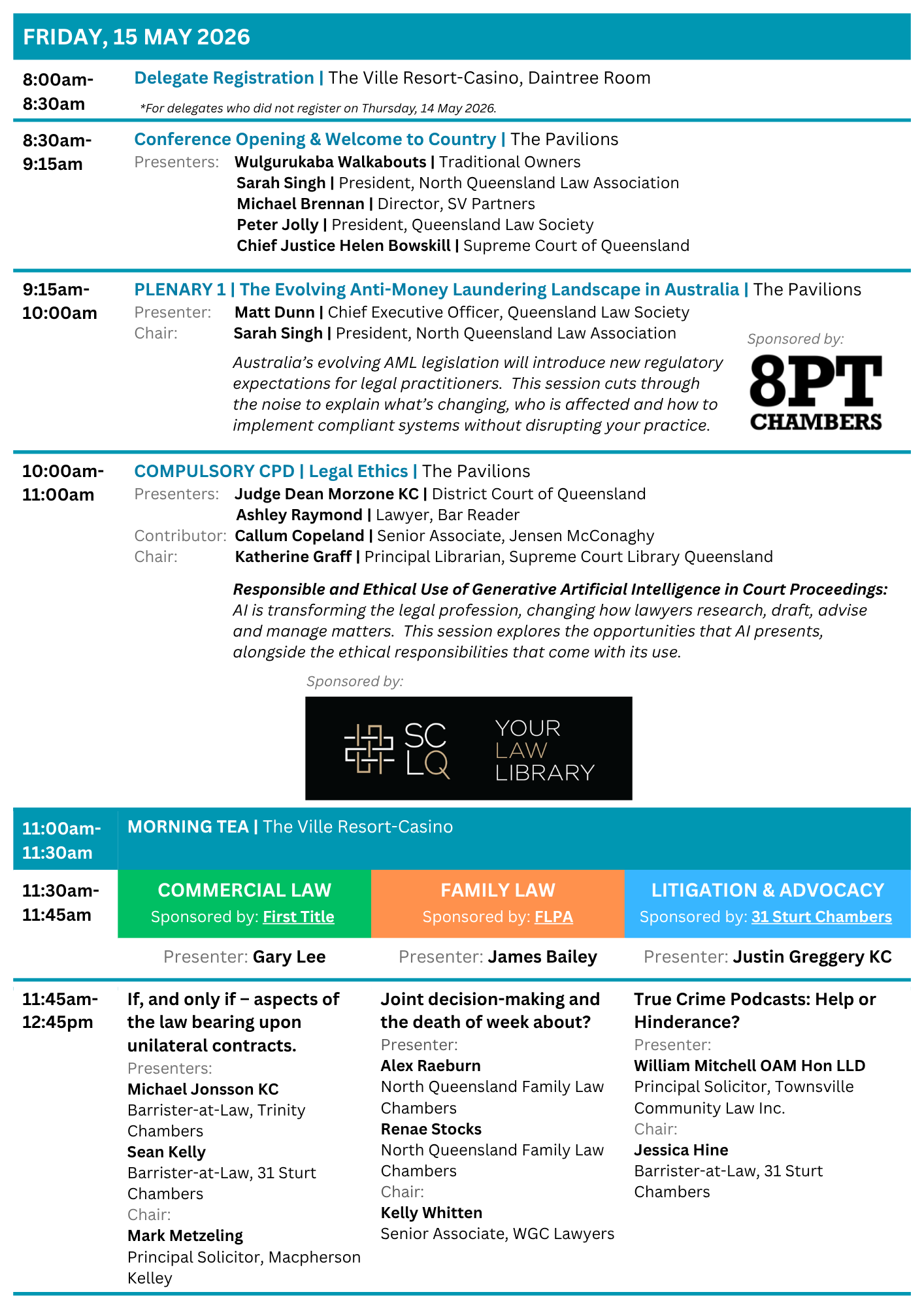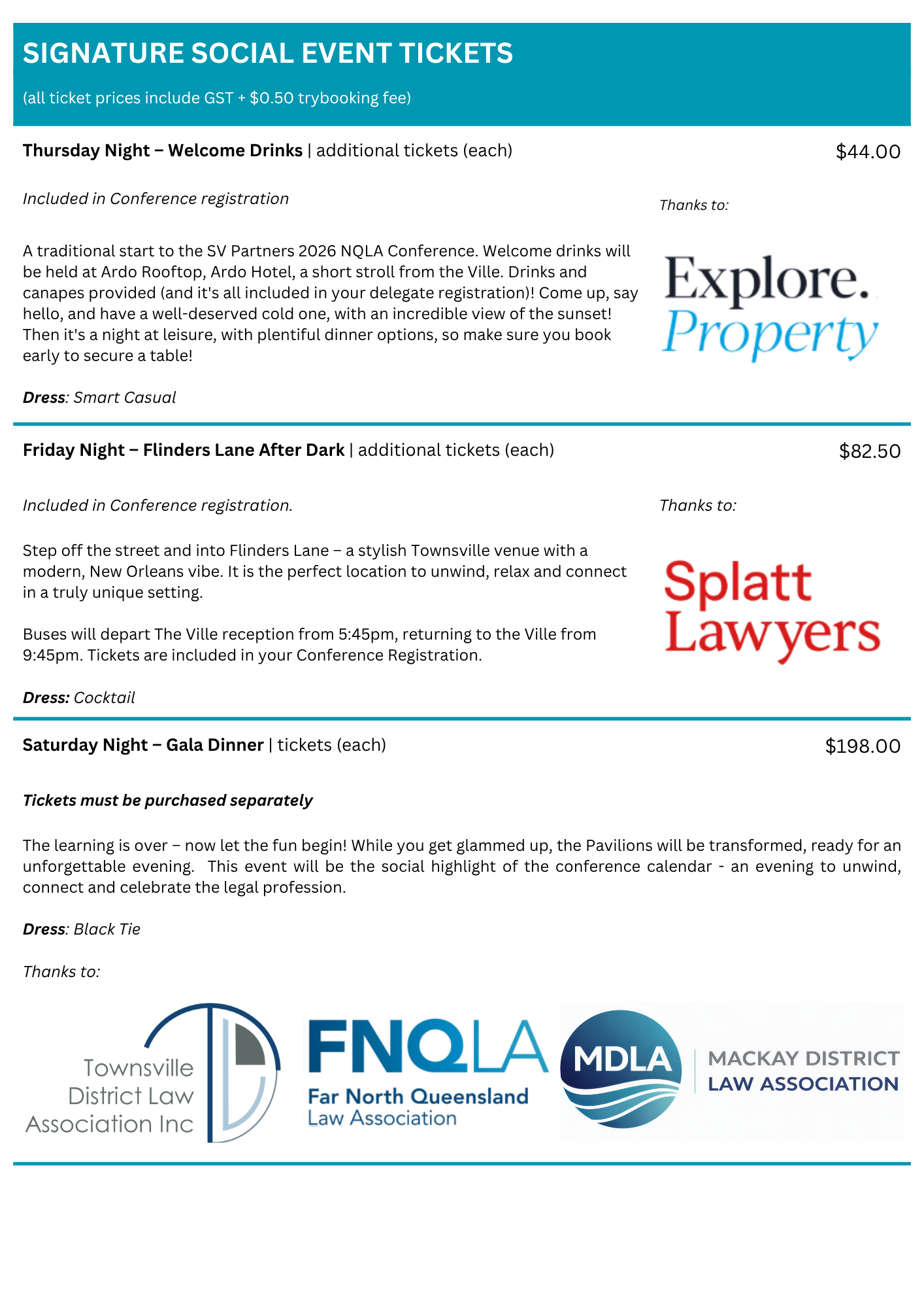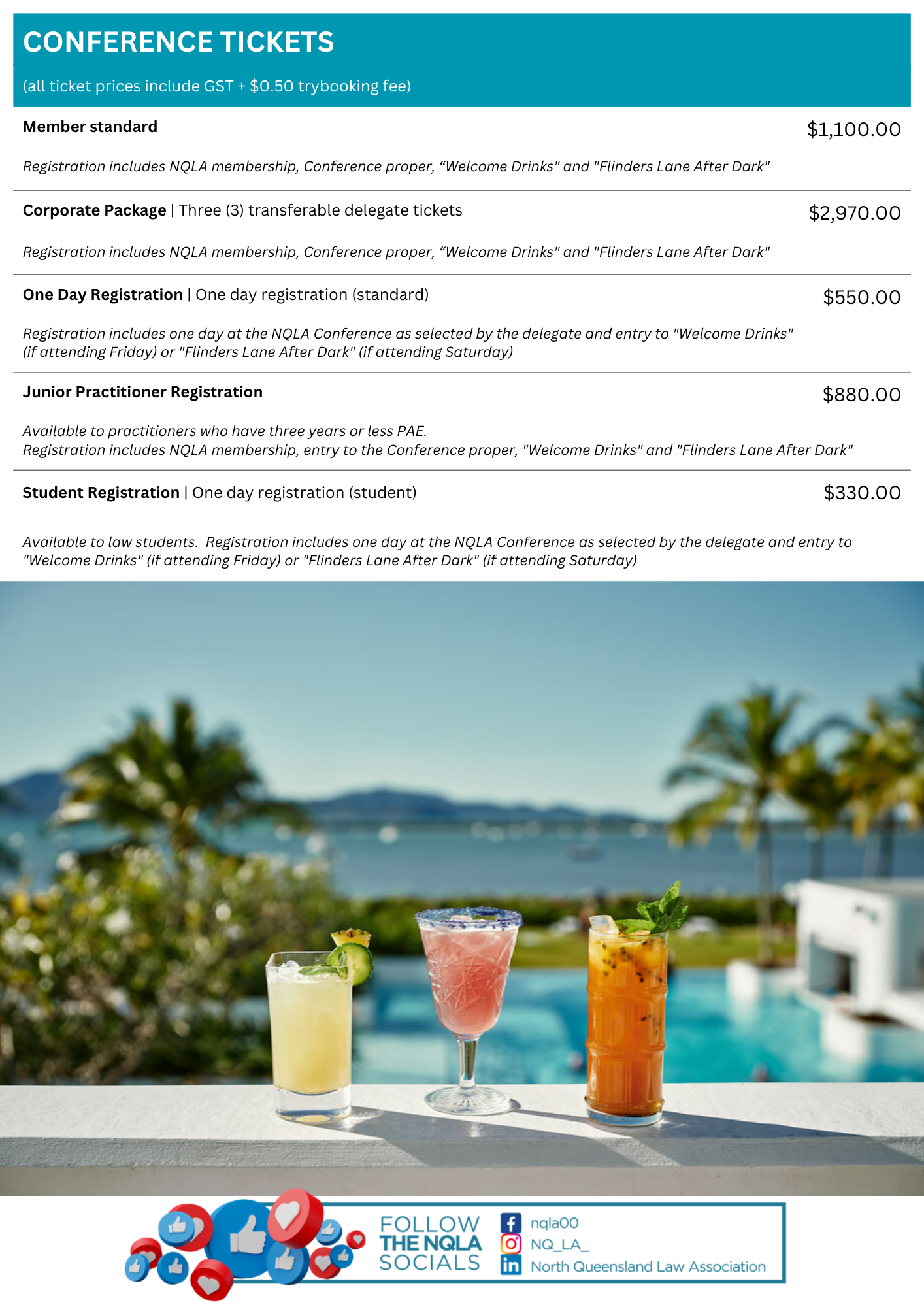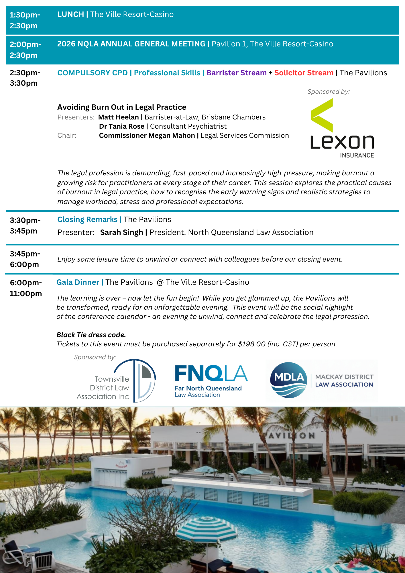 A key function of the North Queensland Law Association is organising an annual conference, which alternates between Mackay, Townsville, and Cairns. Typically, the elected President each year practices in the district where the conference is held.