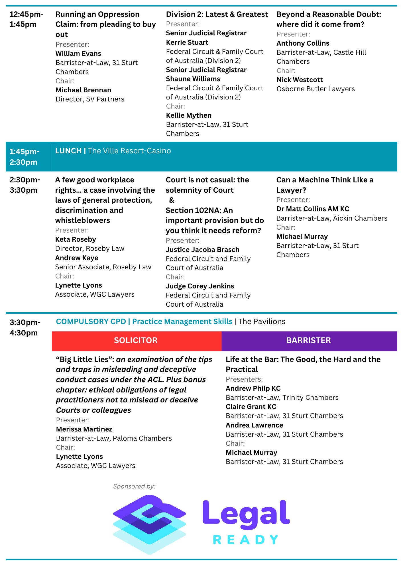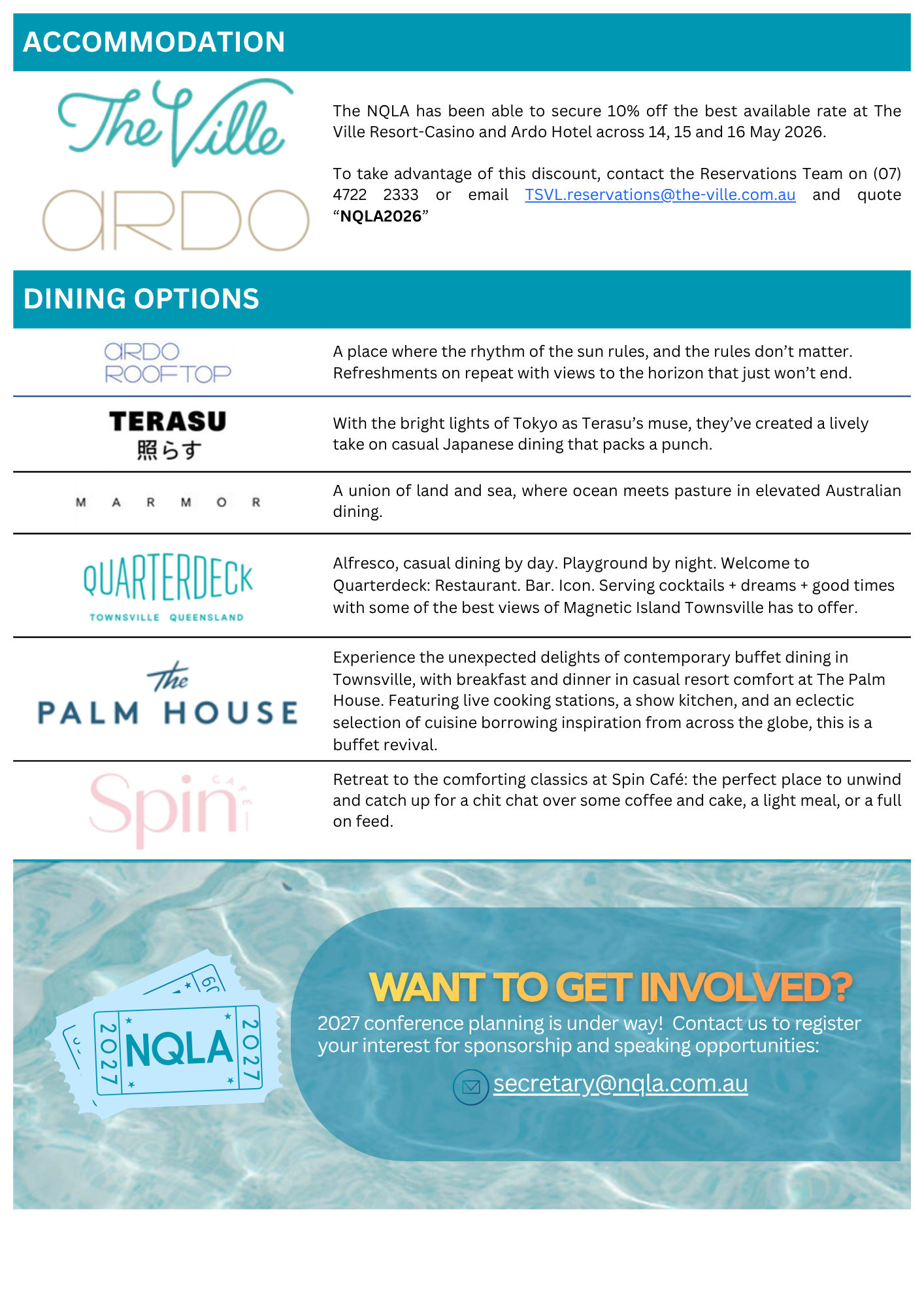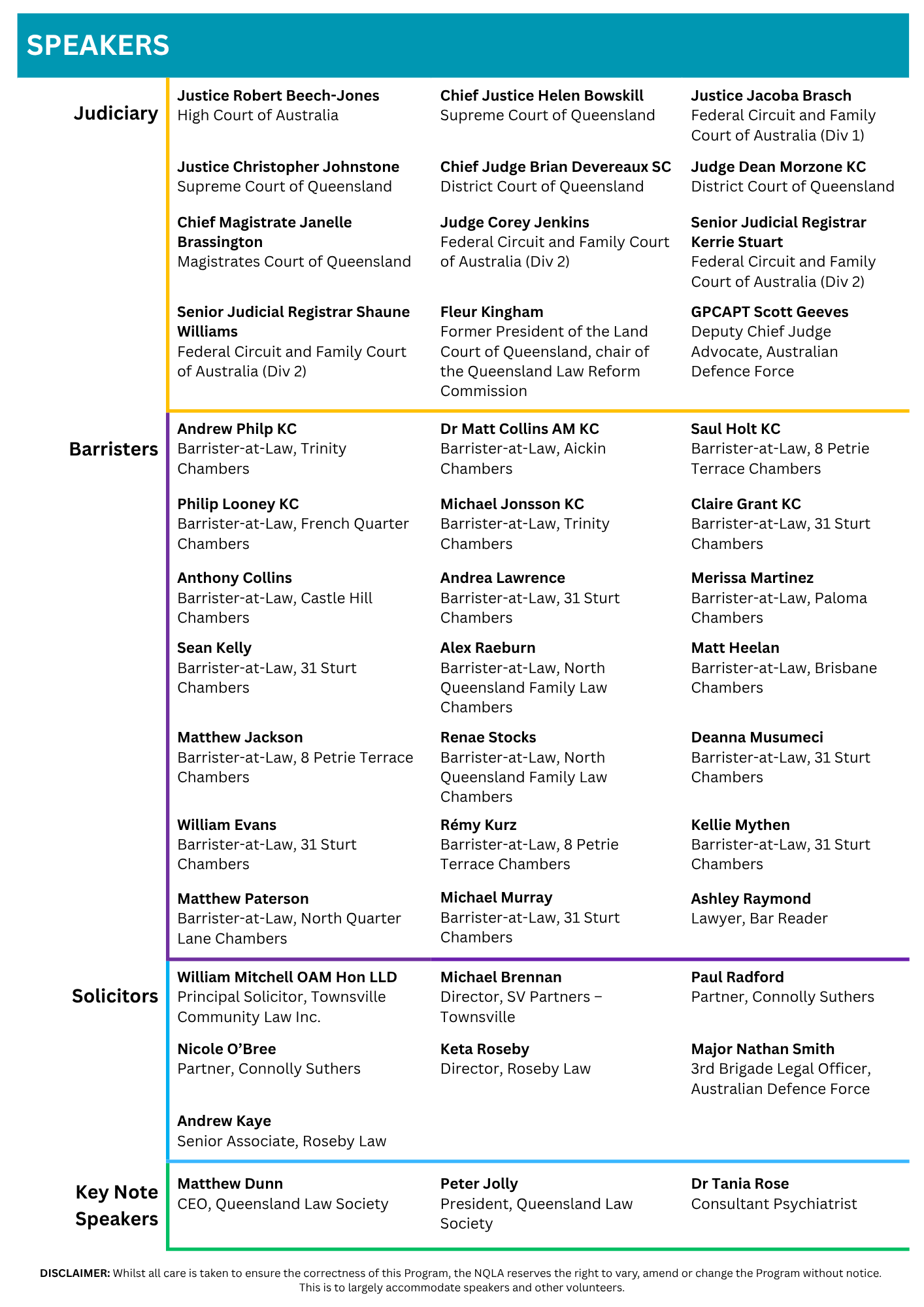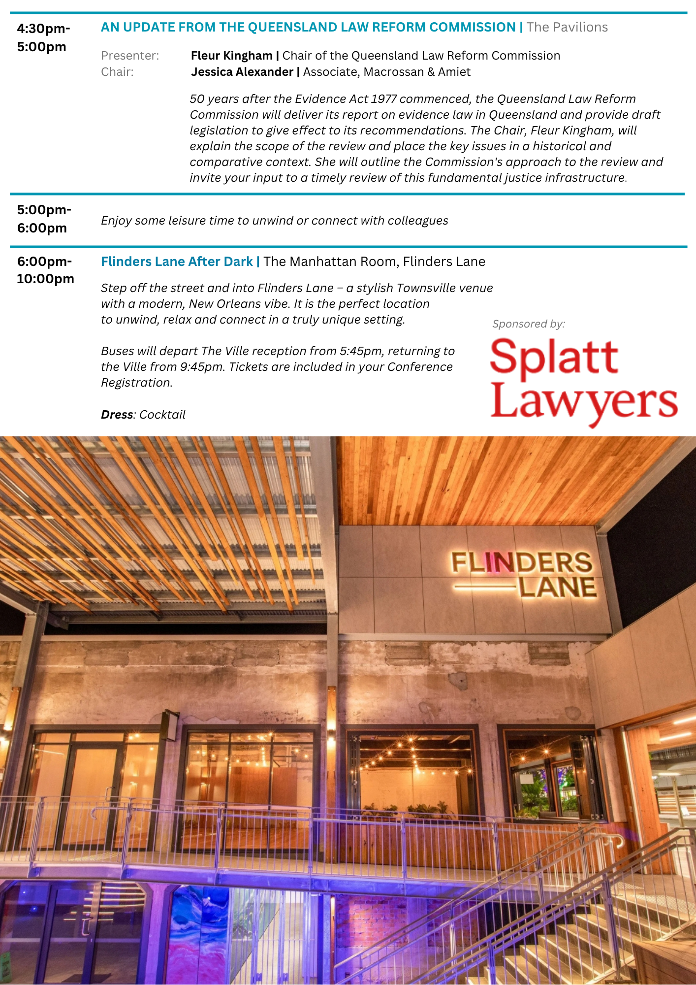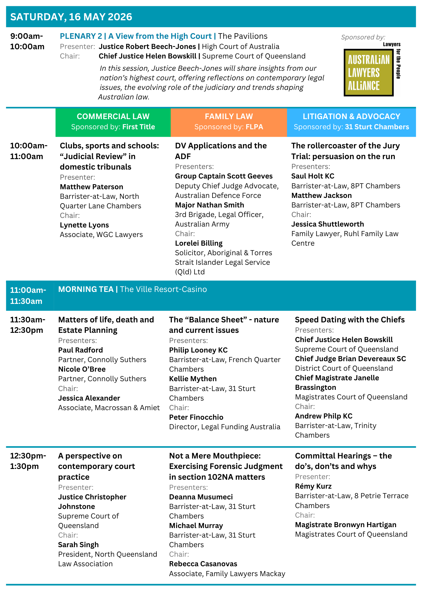 A key function of the North Queensland Law Association is organising an annual conference, which alternates between Mackay, Townsville, and Cairns. Typically, the elected President each year practices in the district where the conference is held.